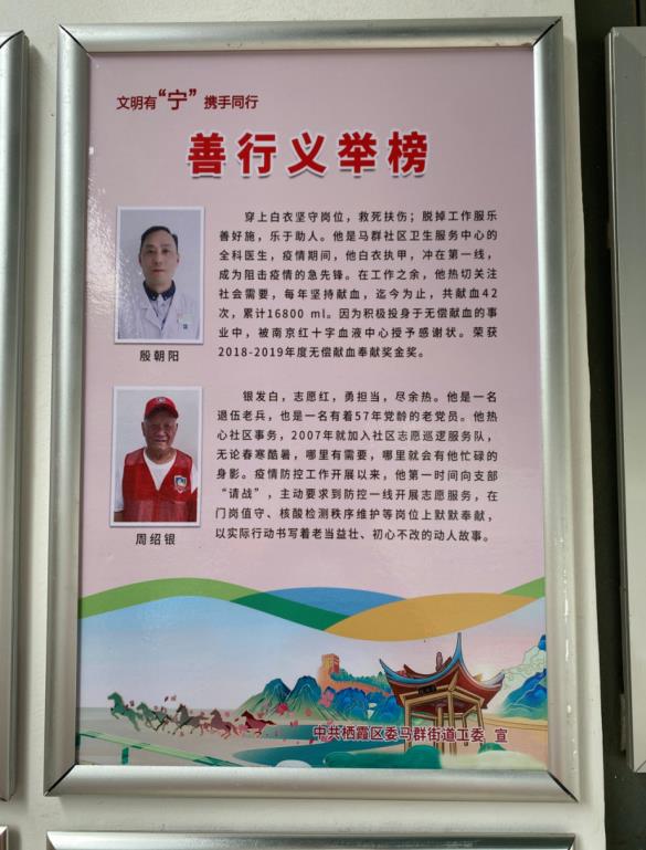 2022年8月,棲霞區(qū)馬群街道“文明有寧 攜手同行·善行義舉榜”經(jīng)過層層推選,南京市棲霞區(qū)馬群街道百水家園社區(qū)“五老”志愿者老黨員老戰(zhàn)士周紹銀榜上有名。