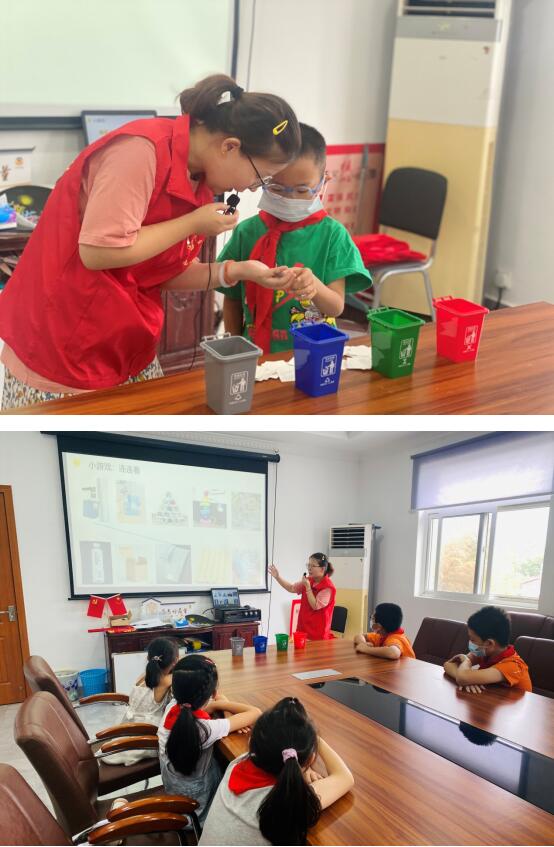 活動室內(nèi)整齊有序地?cái)[放著四色小垃圾桶,志愿者為大家詳解講述了垃圾分類的重要意義,面對面指導(dǎo)孩子們?nèi)绾巫寣ι罾M(jìn)行區(qū)分,并通過小游戲指導(dǎo)大家將垃圾投放到正確的小垃圾桶中,加深了他們對生活垃圾分類知識的印象,也更好的檢測了大家對于所學(xué)知識的掌握程度,并且鼓勵大家在課后多學(xué)習(xí)垃圾分類知識,帶動身邊人一起分。