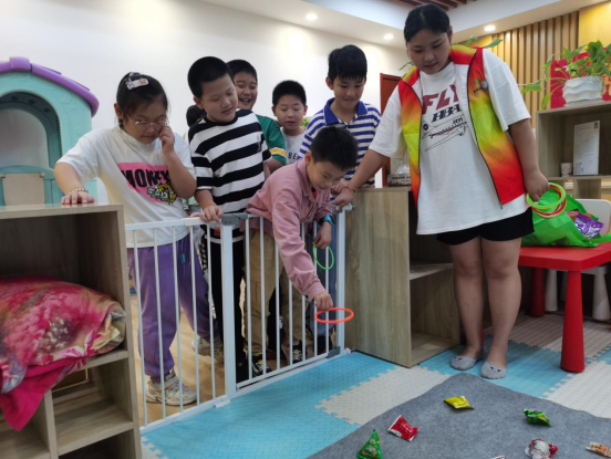 活動(dòng)開始前,社區(qū)工作人員向小朋友們宣傳《未成年人保護(hù)法》,呼吁小朋友們要遠(yuǎn)離校園暴力,對(duì)待同學(xué)和諧友愛?;顒?dòng)開始后,簡單的套圈游戲拉開了本次活動(dòng)的序幕,社區(qū)工作人員組織小朋友們站在線外一個(gè)接一個(gè)的排好隊(duì),努力套中自己想要的獎(jiǎng)品。