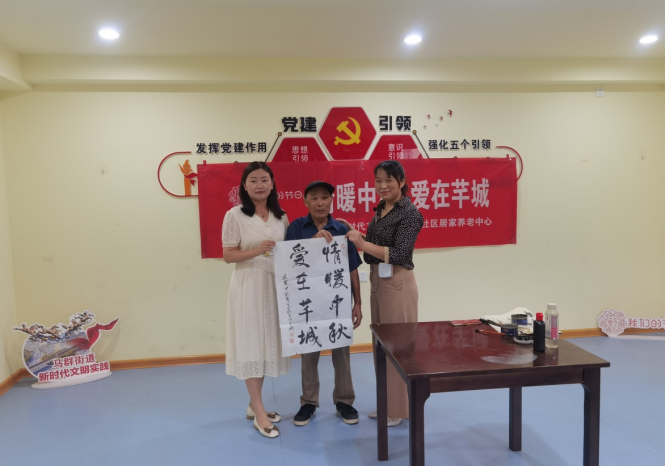 活動中,“芊云匯”的叔叔阿姨們通過民族舞、太極、民族樂器以及黃梅戲傳遞著節(jié)日的喜悅,居家養(yǎng)老中心的老年人們一邊吃著零食,一邊觀看著節(jié)目,開心不已,一個節(jié)目表演完,大家都吆喝著再來一個。表演之余,還設(shè)置了猜燈謎環(huán)節(jié),老人們你一言我一語,爭前恐后地互相猜測,猜不出題時臉上露出疑難之情,猜出答案后高興不已,還可以獲得小禮品一份,整個活動現(xiàn)場洋溢著和諧、喜慶的節(jié)日氛圍?;顒幼詈螅晃粫◥酆谜吒乾F(xiàn)場書寫了今日的活動主題,并送給了社區(qū)。