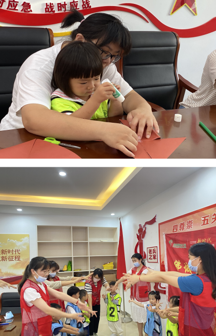 在美術(shù)活動(dòng)《閃閃的紅星》中,小朋友們?cè)诶蠋煹闹笇?dǎo)下,利用卡紙、膠棒、剪刀等工具,共同制作紅星風(fēng)車(chē),制作的同時(shí),老師對(duì)國(guó)慶節(jié)展開(kāi)了介紹與了解,進(jìn)一步培養(yǎng)了小朋友的愛(ài)國(guó)之情,共同贊揚(yáng)祖國(guó)的偉大。通過(guò)伴隨著《歌唱祖國(guó)》的旋律,小朋友們仔細(xì)觀察老師的動(dòng)作,跟著音樂(lè)做手勢(shì)舞,一同感受熱愛(ài)祖國(guó)媽媽的情感。