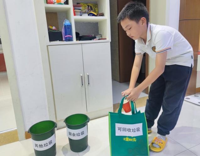 線(xiàn)上學(xué)習(xí)之后,家長(zhǎng)們?cè)诩以O(shè)置“兩桶一袋”,現(xiàn)場(chǎng)教育孩子分類(lèi)收集垃圾。“兩桶”即廚余垃圾桶、其他垃圾桶;“一袋”是指類(lèi)似紙張、塑料瓶、易拉罐等可回收物,可單獨(dú)裝在一個(gè)袋子里。孩子們紛紛表示,書(shū)籍中的內(nèi)容加上自己動(dòng)手實(shí)踐,使自己意識(shí)到垃圾分類(lèi)要從自身做起,從一個(gè)個(gè)綠色環(huán)保的小家庭延伸到社會(huì)大家庭。