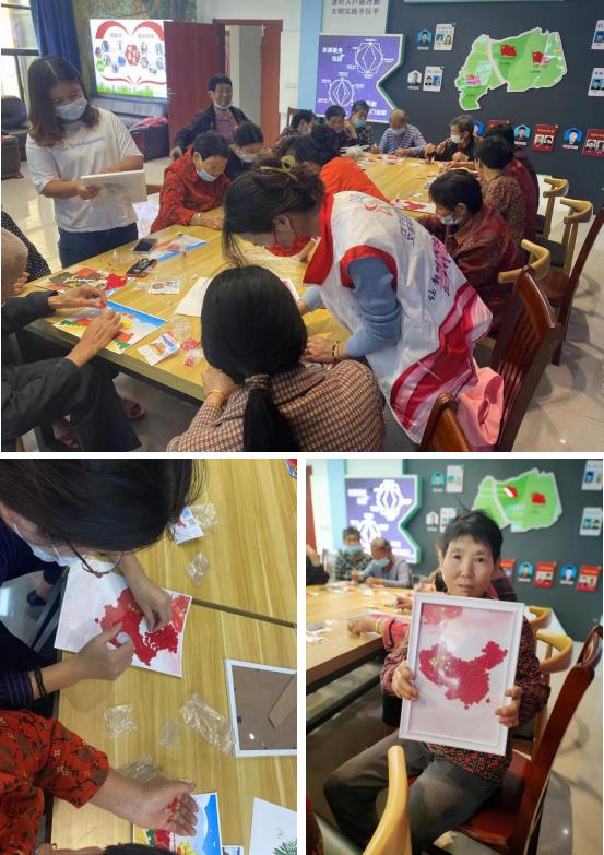活動伊始,志愿者向老年朋友們介紹了國慶節(jié)、重陽節(jié)的由來和本次活動的意義,發(fā)放了紐扣畫的材料,講解紐扣畫的制作方法和注意事項。在志愿者的帶領和指導下,老年朋友們選擇了喜歡的圖案,將紐扣按照顏色、大小分類擺放,選擇合適的紐扣,拿起膠水,仔細地將一顆顆紐扣粘貼在圖畫上。活動結束后,大家開心地展示著自己的作品,紛紛表示“很喜歡這次的活動,大家粘粘紐扣聊聊天,很熱鬧”,“讓我們能夠靜下心來,鍛煉自己的耐心和細心程度”。