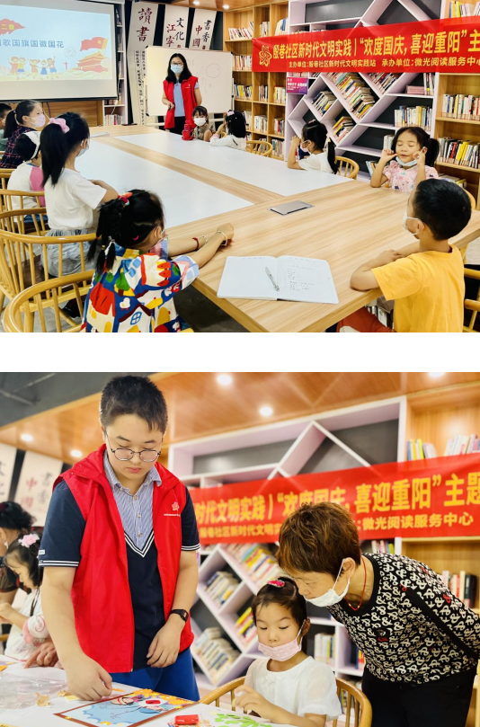 2022年10月長(zhǎng)假,當(dāng)國(guó)慶遇上重陽(yáng)節(jié),南京市江寧區(qū)秣陵街道殷巷社區(qū)新時(shí)代文明實(shí)踐站聯(lián)合微光閱讀服務(wù)中心,在康博睦鄰書(shū)房舉辦“歡度國(guó)慶,喜迎重陽(yáng)”活動(dòng),讓孩子和爺爺奶奶們?cè)趯W(xué)習(xí)、了解有關(guān)兩個(gè)節(jié)日的知識(shí)之余,既增加對(duì)節(jié)日的歡樂(lè)感受,又培養(yǎng)孩子們的愛(ài)國(guó)之心,傳承中華傳統(tǒng)美德!