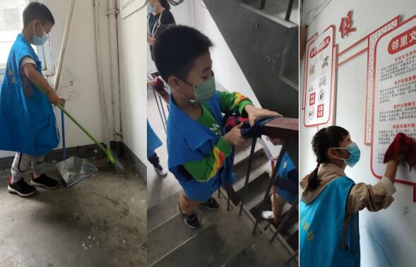 當日下午,青年志愿者和參加活動的小志愿者們早早的就來到了現場。小朋友們激動地穿起碧藍色的志愿服,利索的拿起打掃衛(wèi)生的工具。他們的臉上洋溢著青春的活力與喜悅,準備進入社區(qū)樓道來一場“地毯式”的大清掃。所謂“螢燭微光可以增輝日月”,孩子們的肩膀雖說瘦弱,但卻一個個都能擔重任,為社區(qū)環(huán)境的美化貢獻自己的一份力量。他們有的氣喘吁吁的拎著水桶,有的吃力地抓著比身體還高的掃把和簸箕打掃,還有的踮起腳尖攥緊抹布想要擦去扶手上的灰塵。汗水股股流過臉頰,浸濕了衣服,而孩子們的眼中卻閃爍著自豪和充實的光芒。