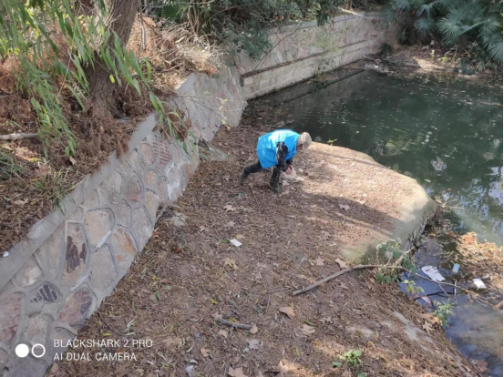 清晨,藍馬甲在日常巡查河道時發(fā)現(xiàn)河邊水草上面漂浮著很多落葉垃圾,嚴重影響周邊環(huán)境。發(fā)現(xiàn)該情況后,藍馬甲們立即拿著笤帚、袋子、火鉗、網(wǎng)兜來到河道邊,打撈河道里的漂浮物,撿拾河岸邊的垃圾和落葉,忙的熱火朝天。在他們的辛勤付出下,原本漂浮在水面上的水葫蘆、浮萍、水草及河面河岸垃圾,都已打撈清除完畢,部分生活垃圾也進行了無害化處理。經(jīng)過他們的清理,河面清澈見底,河道兩側(cè)垃圾不見蹤影,環(huán)境更加整潔干凈。