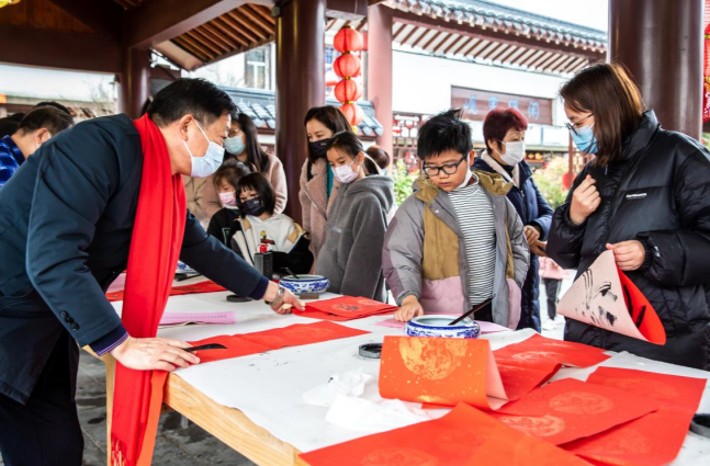 盡管當天冬雨綿綿,但是村民和游客們參與活動的熱情不減,迎新取福的村民游客絡(luò)繹不絕。市民阮女士和一家人驅(qū)車從上海來這里游玩,看到書法家們現(xiàn)場寫福字春聯(lián)表示十分驚喜,“黃龍峴我們是第一次來,這里不僅風景美麗,年味也很濃,孩子們也玩的很開心。”