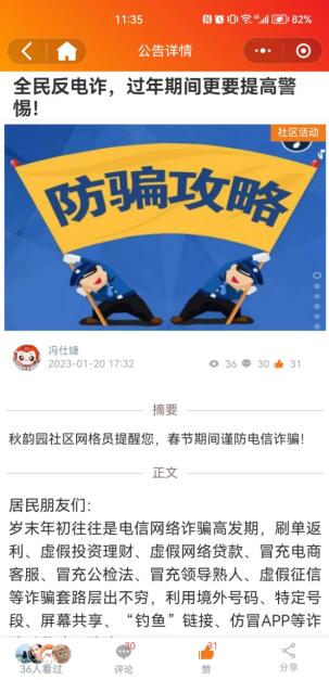 為了提高居民的反電詐意識(shí),預(yù)防和減少電信詐騙案件的發(fā)生,過好平安祥和年,南京市棲霞區(qū)邁皋橋街道秋韻園社區(qū)充分發(fā)揮“掌上社區(qū)”的高覆蓋和時(shí)效性,通過掌上云平臺(tái)“社區(qū)公告欄”模塊發(fā)布“全民反電詐,過年期間更要提高警惕”,加強(qiáng)防范詐騙宣傳教育,構(gòu)建和諧的家庭環(huán)境和社區(qū)環(huán)境。