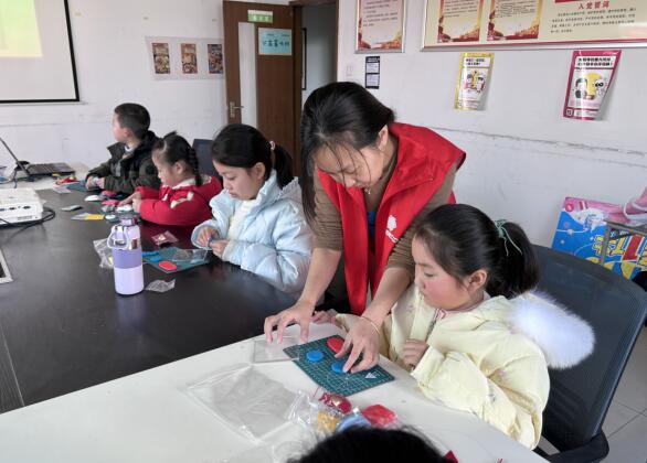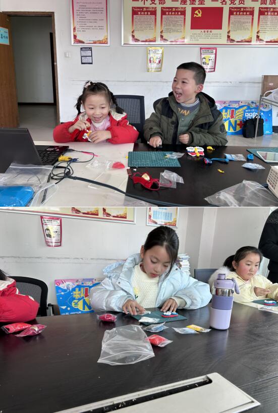 活動中,工作人員帶領孩子們一起玩“大風吹”“蘿卜蹲”游戲,帶動起了全場的氣氛。隨后,工作人員介紹了醒獅和風鈴的由來及寓意,并詳細講解了醒獅風鈴的制作步驟和注意事項,帶領孩子們親手開始制作。在工作人員的幫助下,孩子們認真地研究著手里的材料,依著步驟慢慢完成自己的風鈴,不一會兒,一個個形態(tài)各異、精致喜慶的醒獅風鈴便完成了。
