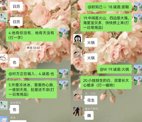 活動由工作人員進行線上主持,首先在微信群里發(fā)出邀請函,發(fā)布活動公告和游戲規(guī)則,讓村民做好準備,群里村民都可以參與,也歡迎村民們邀請自己的家人鄰居進群參加?;顒娱_始,工作人員準備了類型豐富的燈謎,包括日常用品、動植物、字謎等燈謎,成功猜到謎底的村民還能獲得工作人員送出的精美禮品。工作人員也通過猜燈謎的形式祝福大家元宵節(jié)闔家歡樂、團團圓圓,能夠在新一年實現(xiàn)自己的愿望。