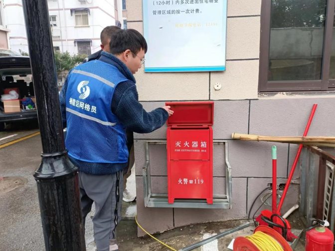 檢查過程中,社區(qū)安全員對小區(qū)內(nèi)滅火器是否過期、放置是否合理、罐體是否變形或損傷、噴口是否堵塞等情況進行逐一排查,并對不合格滅火器進行更換和補充,確保了消防器材的完好、有效,最大限度消除火災(zāi)隱患??紤]到部分消防設(shè)施不完善,社區(qū)安全員還特地安裝了專門的滅火器箱,改善滅火器的存放條件,延長滅火器的使用時效。