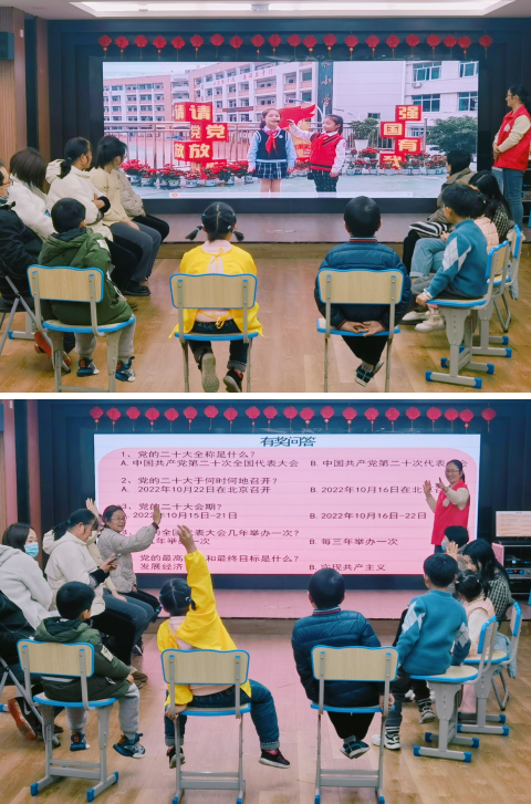 宣講現(xiàn)場(chǎng),新時(shí)代文明實(shí)踐站志愿者通過(guò)PPT,以視頻、圖片加文字說(shuō)明等多種形式,用通俗易懂、簡(jiǎn)短精悍的語(yǔ)言講解了中共一大至二十大的演變,黨的二十大主題、二十大報(bào)告中“三個(gè)務(wù)必”,了解祖國(guó)日新月異的新面貌、新成就,回顧黨帶領(lǐng)我們走過(guò)的光輝歷程?;顒?dòng)最后,志愿者采用黨的二十大知識(shí)問(wèn)答互動(dòng)形式,孩子們踴躍舉手、紛紛搶答,現(xiàn)場(chǎng)氣氛異常激烈。