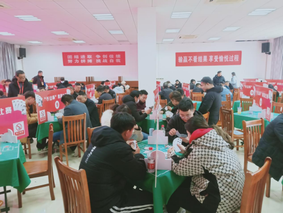 為了公平公正,比賽采取積分淘汰制,共設(shè)一二三等獎、優(yōu)秀組織獎和參與獎若干名。隨著裁判的一聲令下,本次活動正式開始,摜蛋愛好者們秉承著“友誼第一,比賽第二”的原則,各自圍坐一桌,大家以牌會友,在比賽中根據(jù)各自的陣營或是通力合作,或是斗智斗勇,一場棋牌打出了火花四射的感覺,充分展現(xiàn)了大家高超的牌技和團(tuán)結(jié)協(xié)作的意識,現(xiàn)場氛圍熱鬧非凡。