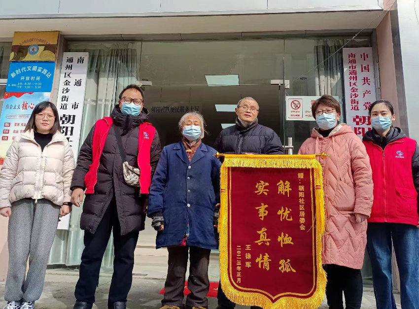 2月10日上午,73歲的孤寡老人王徐軍來到南通市通州區(qū)金沙街道朝陽社區(qū)黨群服務中心,親手將一面寫著“解憂恤孤,實事真情”的錦旗送至社區(qū)書記陳霞的手中。