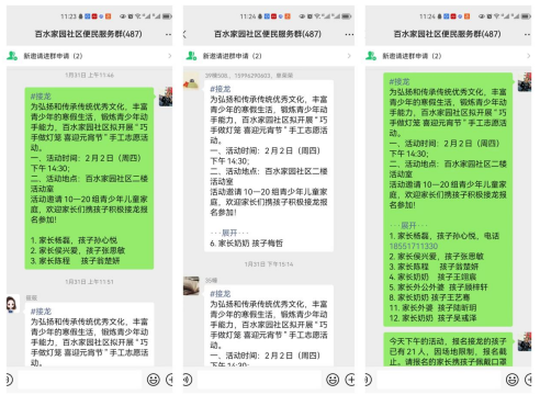 線上宣傳能使社區(qū)服務(wù)方便、快捷,也讓信息的覆蓋面更加廣泛。1月31日,社區(qū)通過(guò)“掌上云”平臺(tái)將元宵節(jié)制作花燈活動(dòng)的通知發(fā)布到居民群、網(wǎng)格群內(nèi),邀請(qǐng)居民在群內(nèi)積極接龍報(bào)名參加活動(dòng),截至2月2日,共有21組家庭報(bào)名。