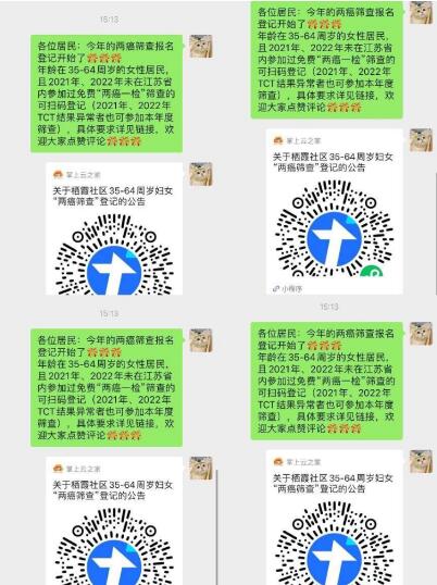 在啟動婦女兩癌篩查工作前期,棲霞社區(qū)在7個掌上云社區(qū)群發(fā)布信息,建立二維碼線上掃碼登記,并及時在掌上云社區(qū)微信群給予答復(fù),幫助預(yù)約,利用掌上云平臺高效地動員符合條件的居民參與兩癌篩查。