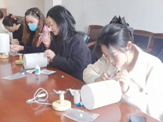 打開插座,點亮臺燈,柔和的光線帶給大家滿滿的溫馨感。大家紛紛露出驚喜的笑臉,并互相贊美、交流彼此的手工作品,現(xiàn)場溫情滿滿、充滿歡聲笑語。