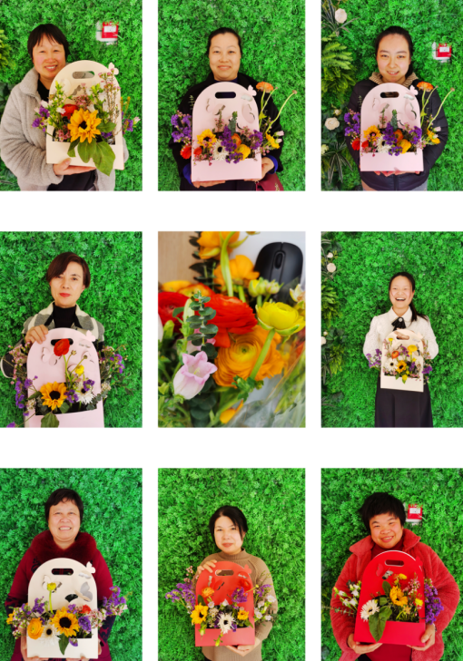 一束束色彩斑斕的鮮花做好了,每個(gè)人用靈巧的雙手將鮮花配以枝葉點(diǎn)綴,精工裁剪,根據(jù)不同的色彩整合,形成了一幅幅獨(dú)具匠心的插花作品,造型各異,典雅別致。