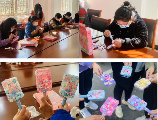 贈人以梳子,既包含了對家人的美好祝愿,也有傳遞愛意之情,更是健康、快樂的代表和象征。志愿者帶領(lǐng)給大家開始奶油膠氣墊梳的手工制作,志愿者一邊為大家講解奶油膠的制作和使用技巧,大家一邊跟著步驟動手嘗試,一起商量著奶油膠氣墊梳的款式,顏色搭配和圖案組合,在大家的精心制作下,五顏六色、形態(tài)各異的奶油氣墊梳就做成了。