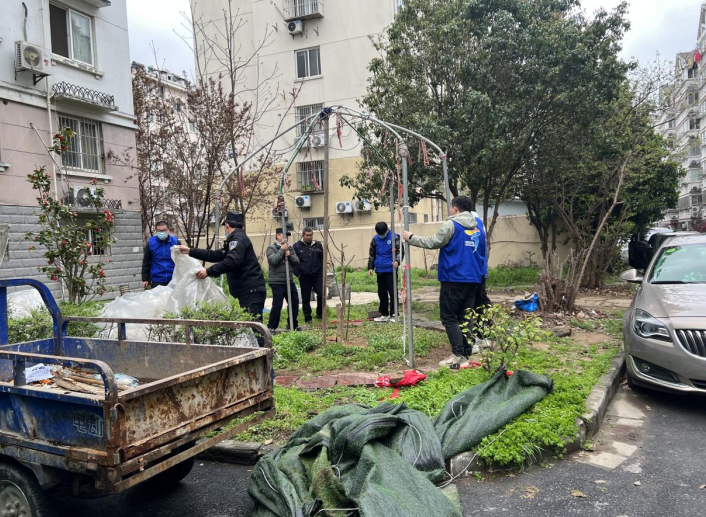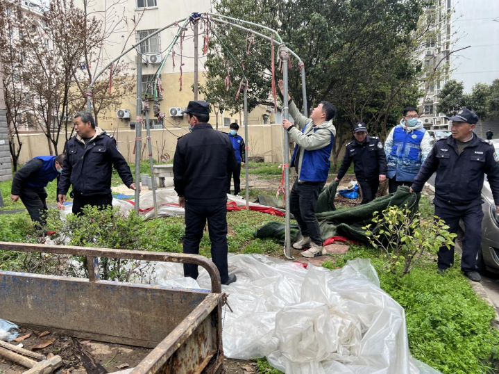 近日,南京市江寧區(qū)淳化街道橋頭社區(qū)網(wǎng)格員在巡查時(shí)發(fā)現(xiàn)在潭橋北園有人私搭違建休閑帳篷,且堆積了不少雜物。違建休閑帳篷不僅影響整體環(huán)境,還會(huì)造成雨水沖蝕泥濘等環(huán)保安全問(wèn)題。為了消除隱患,橋頭社區(qū)網(wǎng)格員、城管、物業(yè)及公安在潭橋北園對(duì)這處違規(guī)建筑進(jìn)行了執(zhí)法拆除,并清除了周圍堆放的雜物。