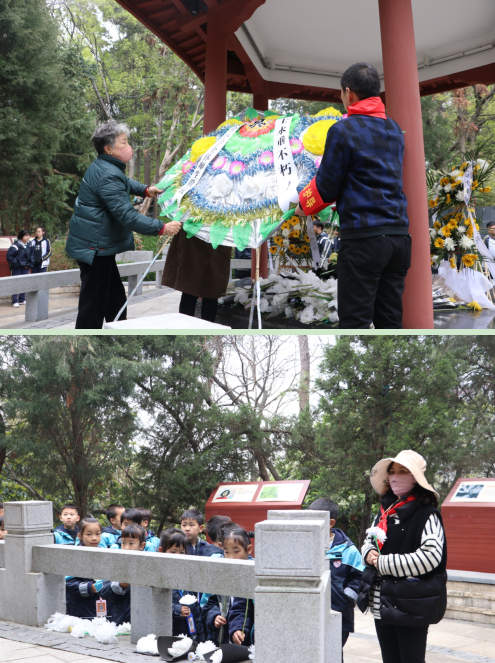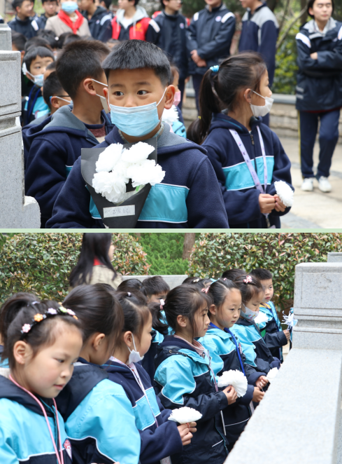 活動現(xiàn)場,莊嚴肅穆,全體成員在烈士墓碑面前向烈士默哀,實小副校長陳勇、德育處厲登高進行總結(jié)。隨后,在相關(guān)工作人員的帶領(lǐng)下,學生們向烈士敬獻花圈,整理挽聯(lián),向烈士三鞠躬,并繞陵墓一周,敬獻小白花。每個人都滿懷著對烈士的敬意和哀思,也表達著對烈士們“拋頭顱、灑熱血”愛國精神的崇高敬仰。