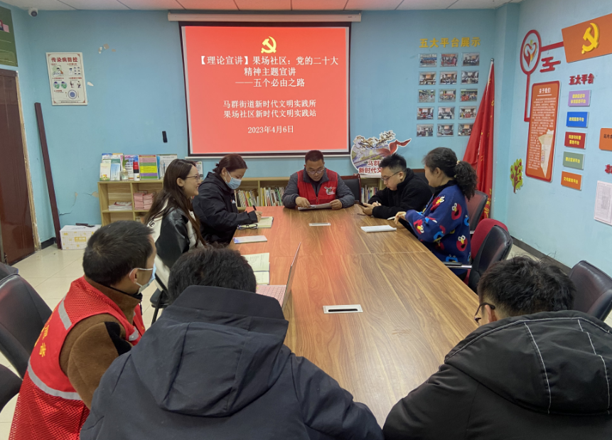 2023年4月6日下午,馬群街道新時代文明實踐所與果場社區(qū)新時代文明實踐站進行站所聯(lián)動,依托理論宣講服務(wù)平臺,在社區(qū)一樓實踐站文化陣地,組織社區(qū)黨員、新業(yè)態(tài)新就業(yè)群體黨員、民兵、退伍軍人、“齊益果”積分制志愿者開展黨的二十大精神宣講。本次宣講人由社區(qū)黨員陶博擔當志愿者,宣講內(nèi)容主要為“五個必由之路”。