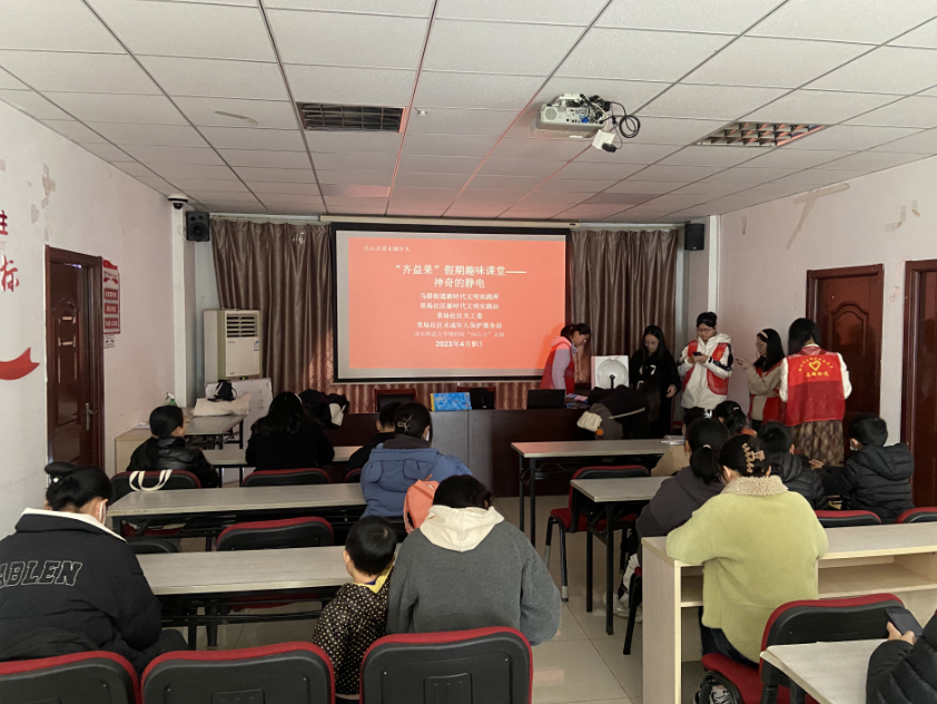 2023年4月9日上午,果場(chǎng)社區(qū)黨總支為民服務(wù)項(xiàng)目“齊益果”假期趣味課堂舉辦年度大型活動(dòng),馬群街道新時(shí)代文明實(shí)踐所、果場(chǎng)社區(qū)關(guān)工委、社區(qū)未成年人保護(hù)服務(wù)站大力支持,依托社區(qū)新時(shí)代文明實(shí)踐站教育服務(wù)平臺(tái),聯(lián)合南師大物科院“向心力”志協(xié)一起,組織社區(qū)未成年人及其家庭、“齊益果”積分制志愿者、新業(yè)態(tài)新就業(yè)群體家庭等在社區(qū)三樓活動(dòng)室開(kāi)展了主題為“神奇的靜電”的科普類(lèi)志愿服務(wù)活動(dòng)。