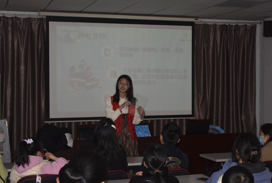 接下來(lái)由主講秦渃熹同學(xué)向小朋友們介紹靜電復(fù)印。秦渃熹同學(xué)向小朋友們提出復(fù)印機(jī)的原理是什么這一問(wèn)題。在一番思索后,小朋友們表示并問(wèn)題的答案,希望主講同學(xué)能夠?yàn)樗麄兘獯鹨苫?。于是秦渃熹同學(xué)取出絲綢,玻璃板,淺盤(pán),泡沫小球等實(shí)驗(yàn)器材,用絲綢在玻璃板上摩擦出“A”字型,蓋在淺盤(pán)的泡沫小球上,結(jié)果泡沫小球也呈“A”字型吸附在了玻璃板上。小朋友們瞪大了眼睛,對(duì)這一神奇的現(xiàn)象感到不可思議。在志愿者的協(xié)助下,每個(gè)小朋友都獲得了一份實(shí)驗(yàn)器材,能夠自己動(dòng)手實(shí)驗(yàn)。在確保小朋友們都觀察到了實(shí)驗(yàn)現(xiàn)象后,主講秦渃熹同學(xué)為小朋友們揭開(kāi)了謎底:正是因?yàn)殪o電能夠吸引輕小物體的特殊性質(zhì),所以絲綢摩擦過(guò)的玻璃板能夠吸引泡沫小球。小朋友們恍然大悟,紛紛表示了解到了新知識(shí)。最后,朱彥澄同學(xué)總結(jié)了本次活動(dòng),并帶領(lǐng)同學(xué)們了解了靜電在電子工業(yè),半導(dǎo)體行業(yè)與醫(yī)療領(lǐng)域如果應(yīng)用不當(dāng)都會(huì)產(chǎn)生危害。在生活中,我們可以通過(guò)勤洗手洗臉,增加空氣濕度等方法來(lái)預(yù)防靜電可能產(chǎn)生的危害。