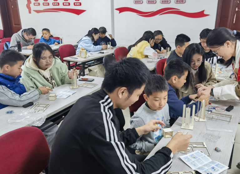 其后,志愿者向大家發(fā)放了本次物理實驗所用的器具,通過對器材的熟練使用,近距離觸碰物理科學的神奇奧秘。在志愿者、家長的幫助下,社區(qū)未成年人紛紛展示自己制作完成的滑輪機,有的用以升調(diào)重物,有的用于傳輸物品等等,全場一片歡聲笑語。