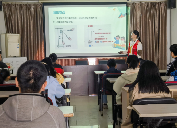 大學生講師強調(diào),滑輪在生產(chǎn)生活中的廣泛運用,對推動人類機械使用起到了極大的作用。滑輪的使用,也是相對容易被每個人在日常生活中熟練運用的。