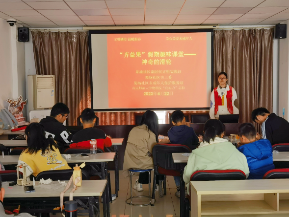 活動中,來自南師大物科院“向心力”志協(xié)的大學生志愿者們安排好社區(qū)未成年人入座,由講師通過PPT課件講述滑輪的物理知識及在日常生活中的常見運通。對于日常運用方面,社區(qū)新業(yè)態(tài)新就業(yè)群體的子女相關(guān)觀摩較多,紛紛舉手進行了列舉。