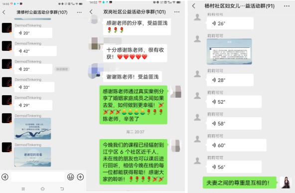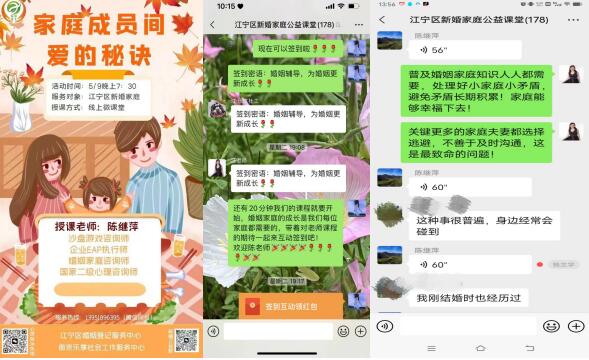 國家二級(jí)心理咨詢師陳繼萍老師用通俗易懂的話語、生動(dòng)典型的案例,對婚姻家庭中如何加強(qiáng)夫妻間溝通、如何營造良好的婆媳關(guān)系、如何做好婚姻家庭親子之間的工作等方面進(jìn)行專業(yè)的解讀。在課堂中,陳老師引導(dǎo)新婚家庭認(rèn)真思考作為家庭成員該如何處理婚姻家庭的關(guān)系,鼓勵(lì)新婚夫婦踴躍發(fā)言,分享自己在進(jìn)入婚姻關(guān)系后處理婚姻家庭關(guān)系的經(jīng)驗(yàn)與做法。最后提出雙方需要做到有互補(bǔ)的概念、改變語言習(xí)慣、實(shí)現(xiàn)有效溝通、培養(yǎng)系統(tǒng)式的視角和表達(dá)。本次活動(dòng)在線朋友認(rèn)為此活動(dòng)對今后處理好婚姻家庭關(guān)系起到積極的促進(jìn)作用。