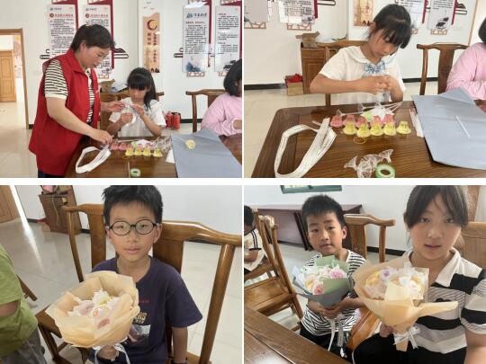 在最后的“DIY制作果凍花束”環(huán)節(jié)中,志愿者一邊講解果凍花束的制作步驟以及注意事項,一邊為大家示范制作過程。孩子們積極配合,準備好材料,將5個水粉色的果凍擺放在玻璃紙中間,用透明膠纏繞一圈,巧妙的固定果凍的位置。大家互相合作,探討學習,給所有的果凍穿上漂亮的“外衣”。活動結(jié)束后,孩子們捧著自己親手制作的果凍花束,每個人臉上都洋溢著自豪燦爛的笑容。