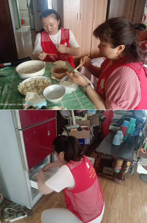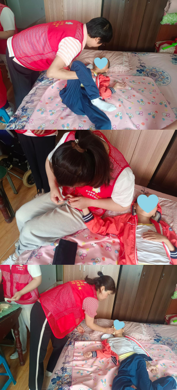 跟隨著蔣爺爺一起回到家中,工作人員開(kāi)始分工合作。2名工作人員在客廳包餛飩,2名工作人員在房間給小朋友做一些日常護(hù)理和肢體康復(fù)。餛飩包完后留存了小朋友中午吃的部分,剩下的全部打包放進(jìn)冰箱,工作人員還幫助蔣爺爺整理了冰箱。在整個(gè)活動(dòng)期間,蔣小朋友的臉上始終都帶著笑容。