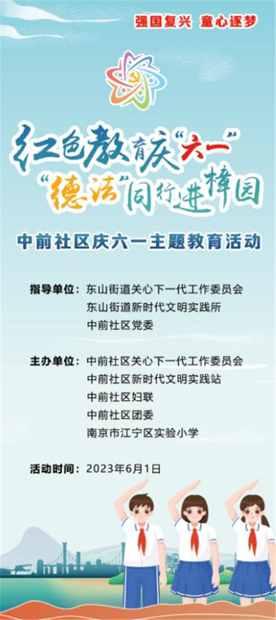 為貫徹落實黨的二十大精神,弘揚以偉大建黨精神為源頭的中國共產(chǎn)黨人精神譜系,深入開展社會主義核心價值觀宣傳教育,深化愛國主義、集體主義、社會主義教育、著力培養(yǎng)擔當民族復(fù)興大任的時代新人。“六一”兒童節(jié)當天,在南京市江寧區(qū)東山街道關(guān)工委、東山街道新時代文明實踐所的指導下,東山街道中前社區(qū)關(guān)工委、中前社區(qū)新時代文明實踐站聯(lián)合大黨委成員單位江寧實驗小學,開展了“紅色教育慶‘六一’ “德法”同行進樟園”主題教育活動。