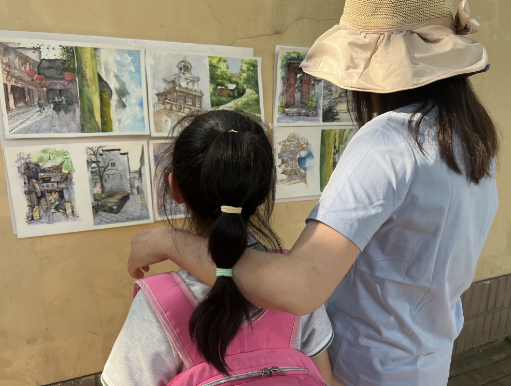 活動持續(xù)到本周末。在本次的展覽活動發(fā)起日,許多上下學(xué)的學(xué)生家長、社區(qū)居民在畫展前駐足欣賞。