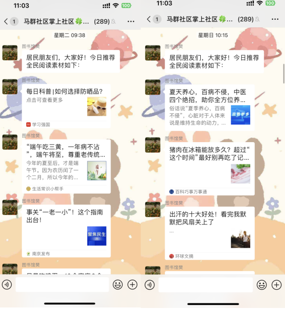 時(shí)代飛速發(fā)展,閱讀的方式也日新月異。每天上午,馬群社區(qū)的全民閱讀志愿者都會(huì)準(zhǔn)時(shí)在“掌上云”社區(qū)群中與大家分享經(jīng)典閱讀素材:一本好書(shū)、一些生活妙招亦或是一條健康養(yǎng)生知識(shí)......讓大家隨時(shí)隨地暢游知識(shí)的海洋,收獲閱讀的饋贈(zèng)。