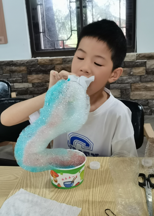 活動中,志愿者老師通過分享實驗視頻引導(dǎo)同學(xué)們操作,通過開展“彩色泡泡龍”的實驗探究,使得同學(xué)們能夠利用生活用品制作有趣的小實驗,并且在這樣一個輕松、快樂的環(huán)境下認(rèn)識到泡泡的產(chǎn)生是水的表面張力在洗潔精這一表面活性劑的作用下形成的。