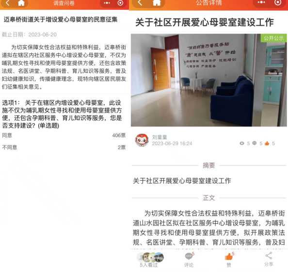 山水園社區(qū)通過線上議事大廳進行協(xié)商,征集建設母嬰室意見。此母嬰室不僅為哺乳期女性尋找和使用母嬰室提供方便,還包含政策法規(guī)、名醫(yī)講堂、孕期科普、育兒知識等服務,普及婦幼健康知識,傳播健康理念。調(diào)查發(fā)現(xiàn),多數(shù)居民持支持態(tài)度,肯定了社區(qū)的工作,同時也有部分居民在持中立態(tài)度,認為母嬰室會不會就空掛一個牌子。對此,社區(qū)在掌上云社區(qū)內(nèi)發(fā)布公告,廣泛吸納群眾的服務需求,并結合社區(qū)共建資源,為育齡婦女提供暖心服務。下一步,社區(qū)將繼續(xù)圍繞民生服務,推動社區(qū)協(xié)商議事工作走深走實。