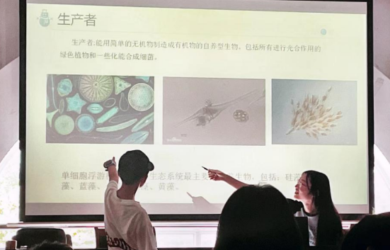 海洋生態(tài)系統(tǒng)是全球最重要的生態(tài)系統(tǒng),人類的生存和發(fā)展與海洋息息相關(guān)。在海洋生態(tài)科普上,曾雪鈺首先用動(dòng)畫引出了海洋生態(tài)系統(tǒng)的概念,然后著重介紹了海洋生態(tài)系統(tǒng)的生物成分和非生物成分。在曾雪鈺同學(xué)的引導(dǎo)下,小朋友們認(rèn)識(shí)了許多微小精妙的浮游植物,在一輪輪問答中,小朋友們了解了不少海洋動(dòng)物之“最”,也展示了自己豐富的知識(shí)儲(chǔ)備和較高的海洋素養(yǎng)。明明一身綠,為什么被稱為“紅樹林”?海藻場有什么作用?珊瑚蟲和珊瑚是什么關(guān)系?在解決一個(gè)又一個(gè)問題的過程中,小朋友們認(rèn)識(shí)到海洋生態(tài)系統(tǒng)的多樣性與重要性,并與老師一起探討海洋生態(tài)系統(tǒng)面臨的問題與解決之道。