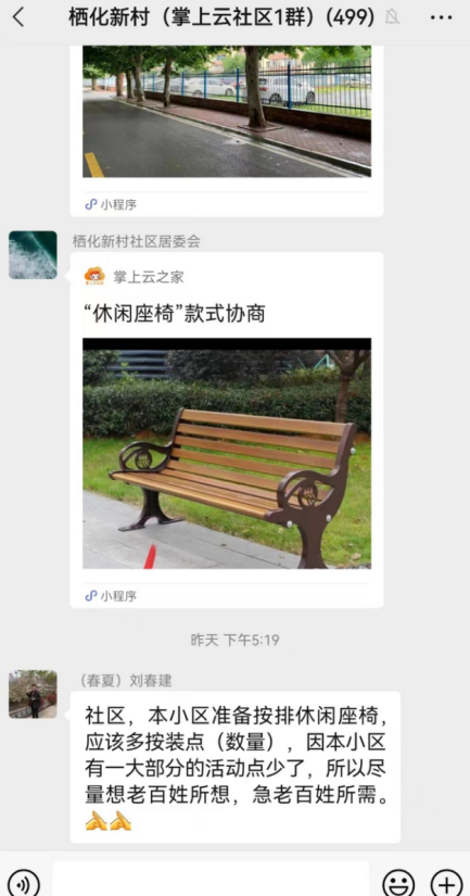 “椅子只要牢固就行,希望把周邊樹木再修剪一下。”居民們在“掌上云社區(qū)”中充分討論,并認真選擇自己心儀的座椅款式。