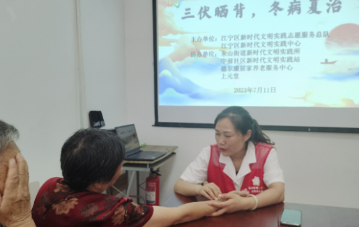 7月11日是今年夏季入伏第一天,三伏天是"冬病夏治"的好時節(jié),為了給社區(qū)老人科普宣傳三伏曬背、冬病夏治的好處,南京市江寧區(qū)東山街道中前社區(qū)新時代文明實踐站聯(lián)合德爾康居家養(yǎng)老服務中心開展“三伏曬背,冬病夏治”的主題活動。