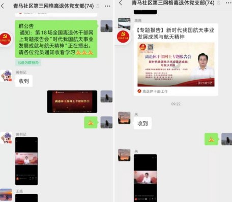 一個多小時的視頻學(xué)習(xí),老同志們不僅深入了解了新時代我國航天事業(yè)發(fā)展成就,學(xué)習(xí)了自力更生、勇于挑戰(zhàn)的航天精神,更增強(qiáng)了他們發(fā)揮余熱、奮發(fā)圖強(qiáng)的理想信念。在現(xiàn)場的黨員踴躍發(fā)言,分享自己的觀看心得,未能到場的黨員也在“掌云”微信群中發(fā)表了自己的心得體會。