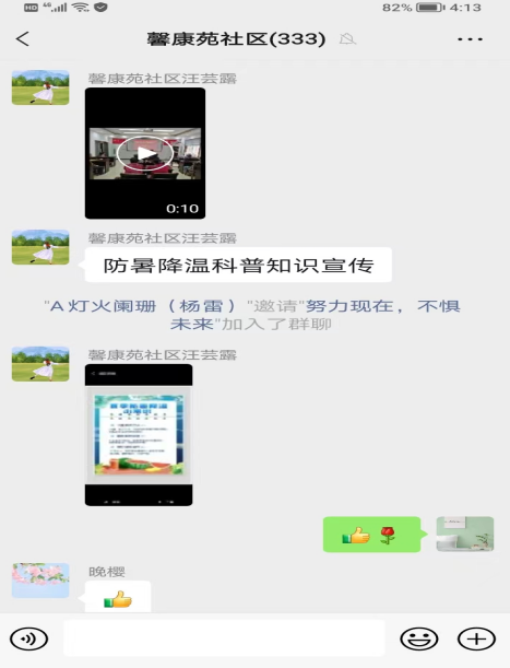“趁“熱”,這份防暑降溫指南請查收.......”居民群內(nèi),社區(qū)工作人員通過友情提醒、鏈接推送、圖文科普、視頻宣教、互動分享等形式為居民們普及了熱射病相關(guān)知識以及使用的防暑知識,提醒居民防暑重在預(yù)防,要避免在日照強(qiáng)烈的時間段劇烈運(yùn)動;外出要做好防護(hù),盡量走在陰涼處;多喝水補(bǔ)充有機(jī)鹽分;居家空調(diào)溫度不宜太低;家中可常備仁丹、藿香正氣水等防暑藥品;如高溫引發(fā)身體不適,應(yīng)及時就診治療。“夏季莫貪涼,謹(jǐn)防空調(diào)病”、“我家就經(jīng)常熬些綠豆湯”、“冰鎮(zhèn)食品注意少吃”、“外出可隨身攜帶清涼油、藿香正氣等防暑藥品”、“西紅柿、絲瓜、苦瓜也是不錯的選擇”......居民們紛紛分享道。