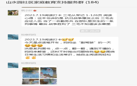 讀書打卡活動于7月14日至8月12日開展,為期一個月,活動一經(jīng)發(fā)布,群內(nèi)的家長和孩子紛紛積極參與此次線上活動,在微信群里打卡上傳與孩子閱讀的照片和視頻,分享孩子的閱讀打卡心得。