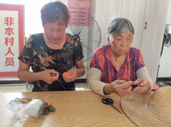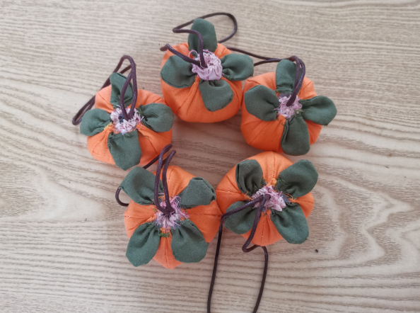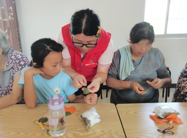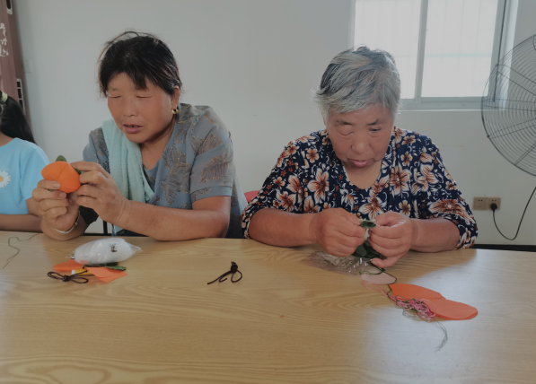 柿子香包掛件,事事如意的諧音,寓意著美好生活的祝愿?;顒?dòng)現(xiàn)場(chǎng),志愿者給村民發(fā)放了柿子香包材料包,并且介紹了柿子香包的縫制方法步驟——對(duì)齊縫合、翻面整平、四角縫合、翻面穿繩、放入香囊、拉緊繩子......志愿者一步一步帶領(lǐng)村民學(xué)習(xí)縫制,大家從一開始的小心翼翼到熟能生巧,互相討論、互相幫助,邊縫制邊感觸道:“親手縫制個(gè)柿子包,希望家人事事如意。”在志愿者的耐心指導(dǎo)下,一個(gè)個(gè)精美雅致的柿子香包逐漸呈現(xiàn)在大家的眼前。