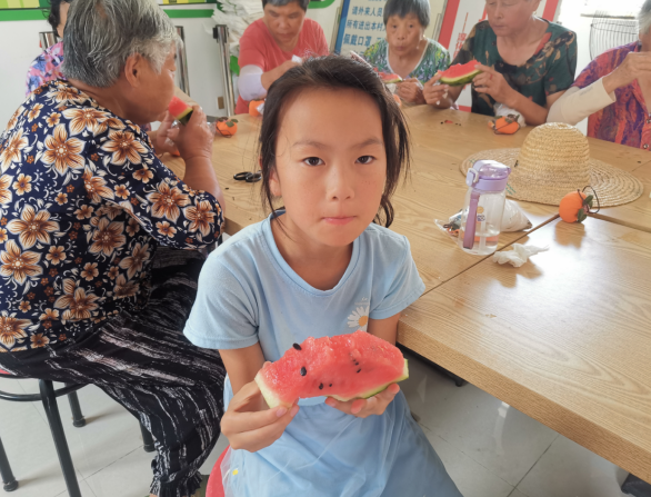 在“啃秋”環(huán)節(jié),志愿者切好西瓜發(fā)給村民,村民們一邊大口大口地吃著西瓜,一邊聽志愿者科普二十四節(jié)氣的由來以及立秋和“啃秋”傳統(tǒng)習(xí)俗的相關(guān)知識(shí),每個(gè)人都“啃”得不亦樂乎,歡笑聲充斥著整個(gè)活動(dòng)室。