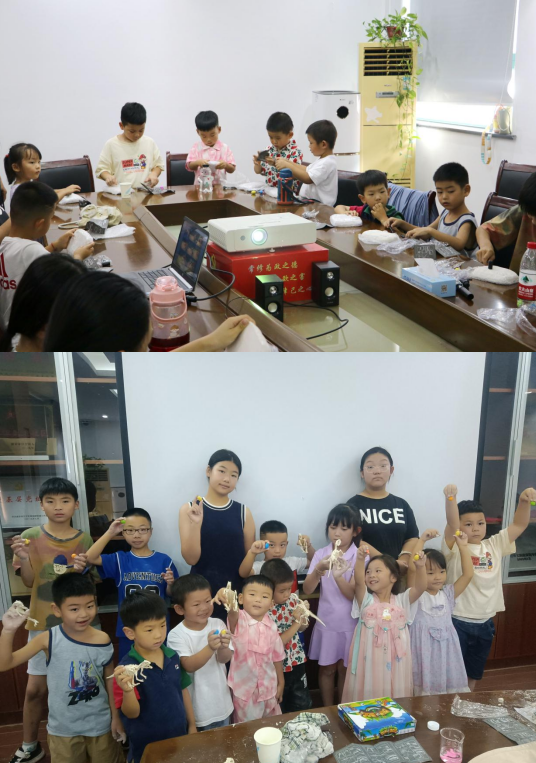 最后,志愿者帶領(lǐng)孩子們模擬考古恐龍環(huán)節(jié),小朋友們化身為勇敢的小小考古家,帶上防護(hù)鏡、手套,手拿小錘子等工具,全身心地投入到模擬考古土塊中挖掘“恐龍化石”。不久,小朋友們就“挖掘”出了不同的“恐龍化石”,大家拿著自己獨(dú)有的“考古”作品合影留念,現(xiàn)場(chǎng)傳來(lái)陣陣歡聲笑語(yǔ)。