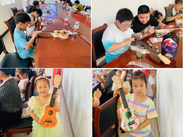 隨后,志愿者帶領(lǐng)青少年進行彩繪尤克里里手工制作。志愿者詳細講解了制作方法后,將材料發(fā)放給大家后。孩子們發(fā)揮自己的想象力,繪圖,描線、調(diào)色、上色,孩子們發(fā)揮想象畫上屬于自己的小世界,有的追求“極簡美”繪制了簡單的花紋,有的用大色塊打底繪制了卡通圖案,在志愿者的耐心指導(dǎo)與小朋友們的無限創(chuàng)意下,一把又一把精致且好看的尤克里里展現(xiàn)在大家眼前。