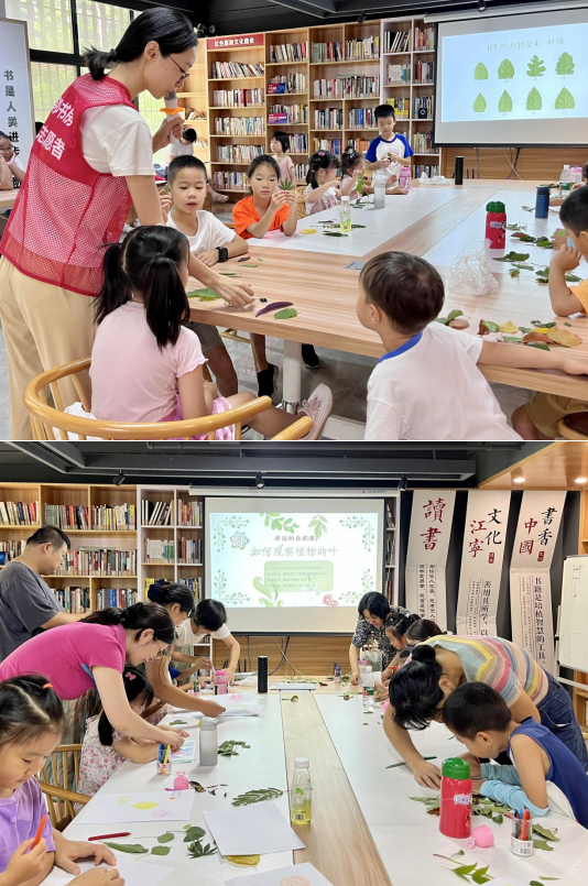 活動開展前,社區(qū)志愿者們事先提醒孩子們當天需準備不同顏色、大小和形狀的葉子帶到書房?;顒赢斕欤驹刚叻窒砹酥参锏娜~自然觀察書籍《繪認植物第一課》、《好孩子的自然觀察課:葉》中的葉的作用、葉的結(jié)構(gòu)和葉的觀察等內(nèi)容。隨后,志愿者要求孩子們觀察葉片的顏色、紋路和質(zhì)地等特征。孩子們積極參與并用放大鏡仔細觀察手中的樹葉,不時互相交流發(fā)現(xiàn)。孩子們的好奇心被激發(fā)出來,對植物葉片的奇妙特征有了更深的了解。